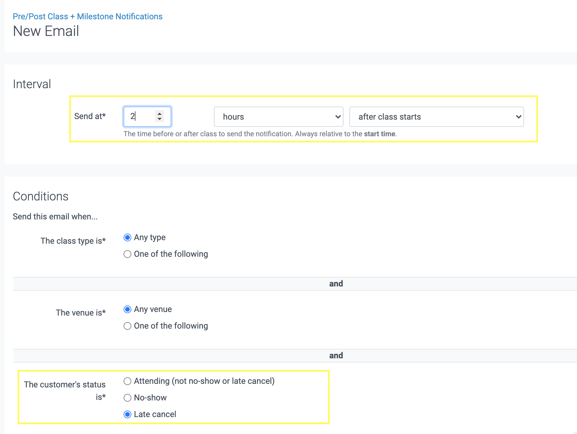 You can choose to always send this email to customers who late cancel. Or maybe you only want to send to customers of a specific class type.