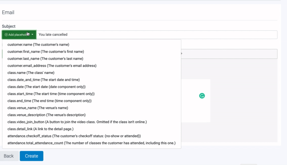 Use the placeholders in the subject and body to auto-complete things like recipient name, class name, and class start time.