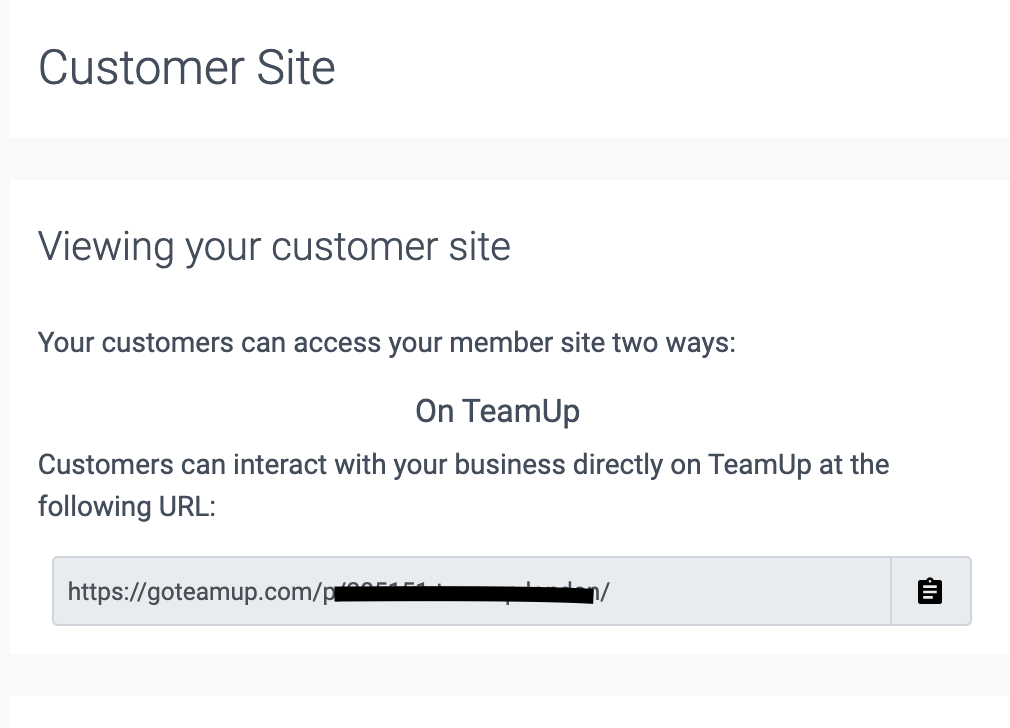 Paste your customer site URL into the Website field. The URL for your customer site can be found from Customer Experience within TeamUp.