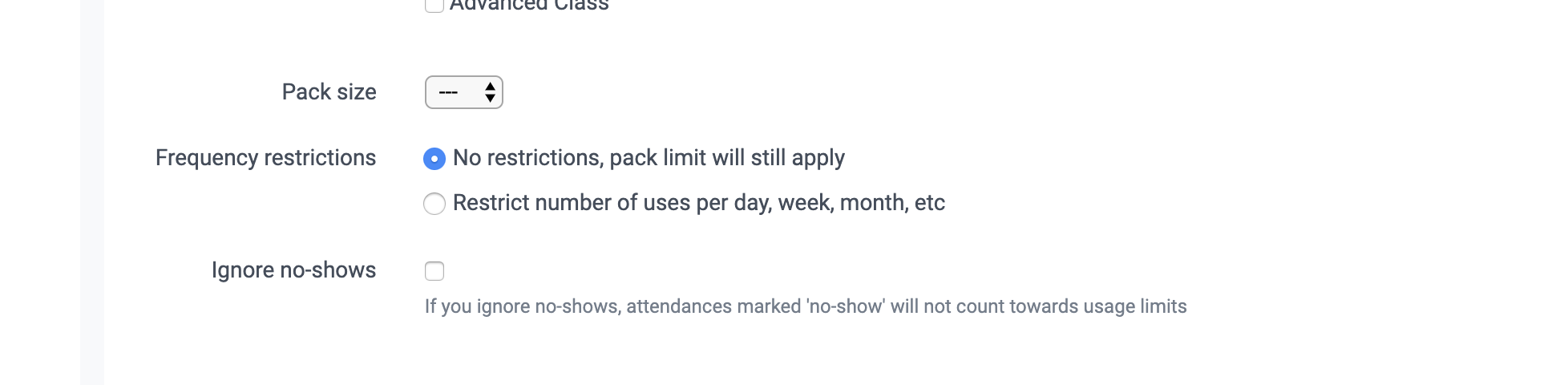 The pack size controls how many sessions the customer will get on the pack they purchase. You can customise the limits further by adding frequency restrictions, such as a daily, weekly, monthly, or yearly allocation.