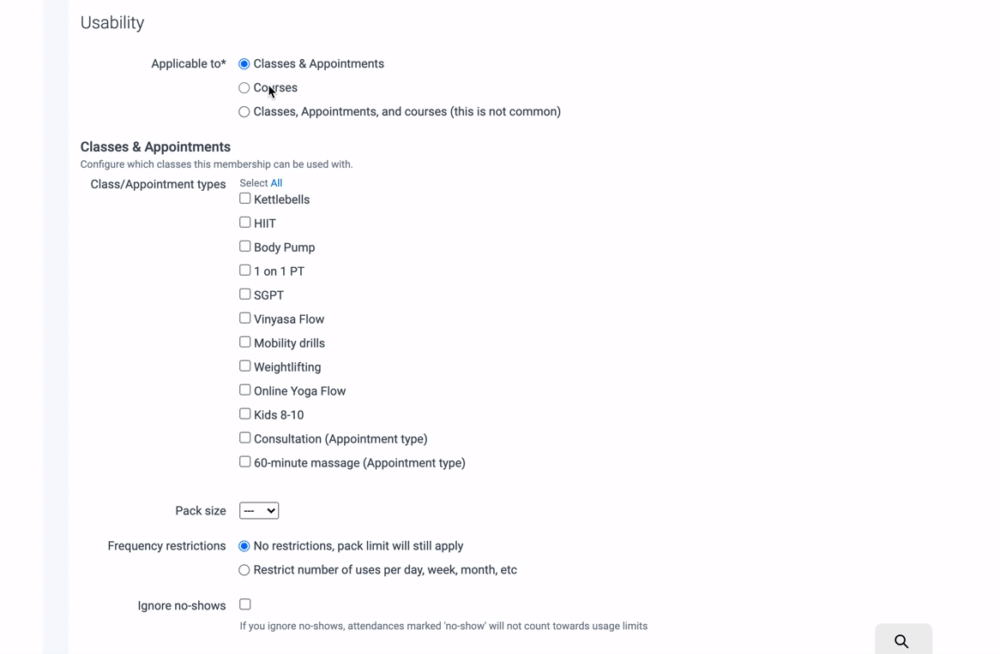 In this section, you'll be able to configure which classes/appointments and/or courses customers should be able to book and their allocation.