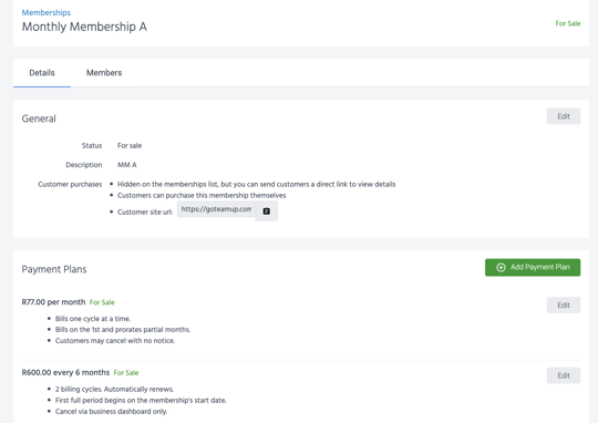 Or, you might want to offer different monthly prices within the same membership, depending on the commitment length - this can be achieved by creating multiple payment plans for the membership.