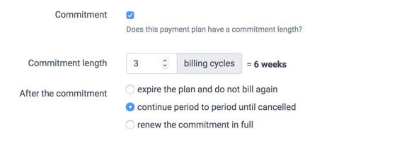 In this example, the plan requires 3 billing cycle payments (i.e., 6 weeks) and then continues every two weeks until canceled.