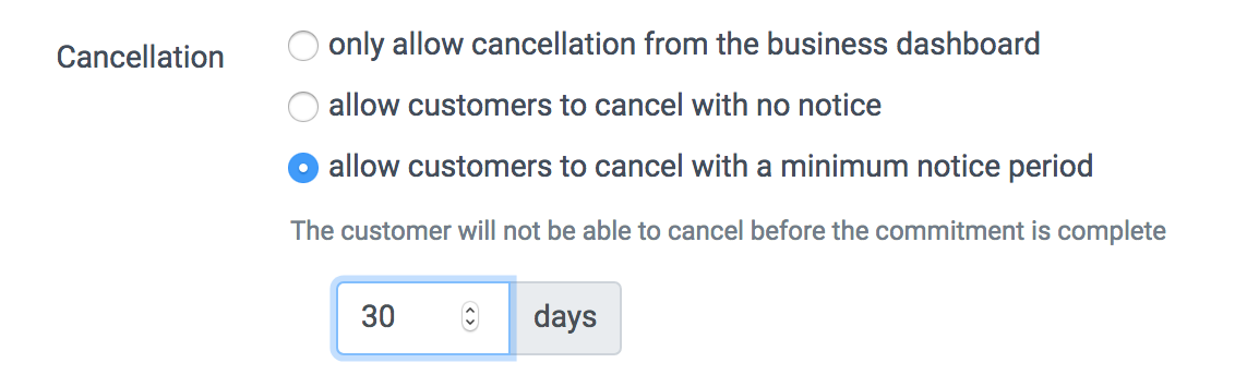 - Allow customers to cancel with no notice: The customer can cancel their membership with no notice.