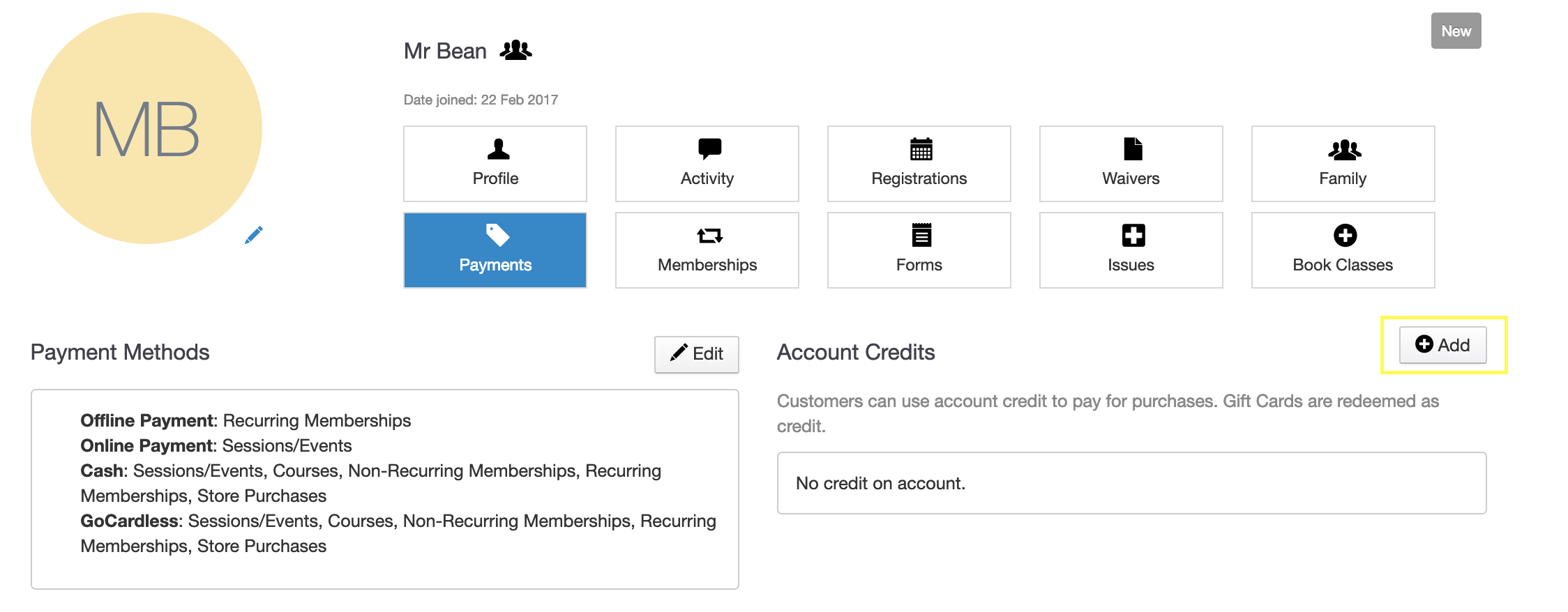 Click on the "Payments" tab, and then click "Add" next to Account Credits: