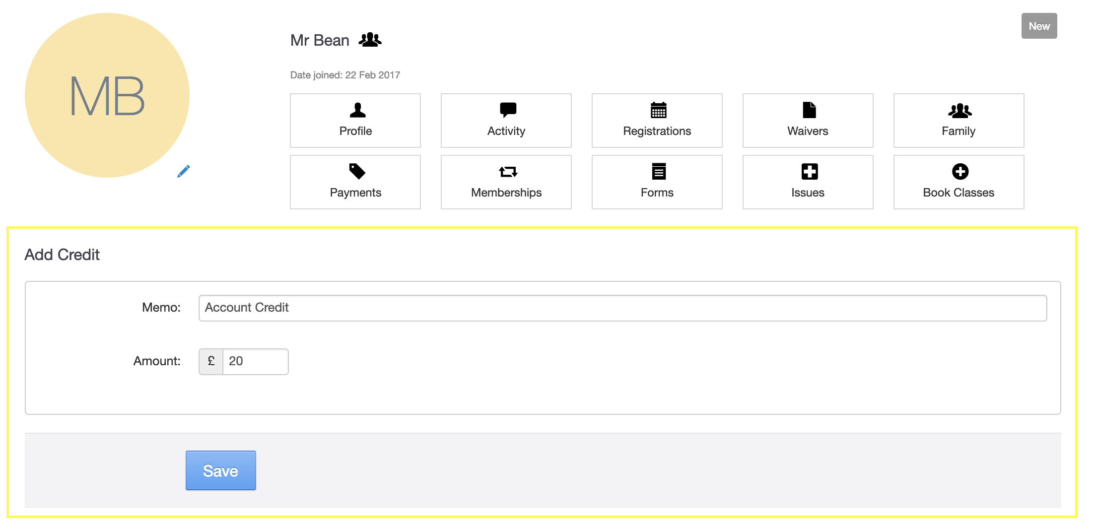 Navigate your way to Customers>> select the customer you would like to add credit to.