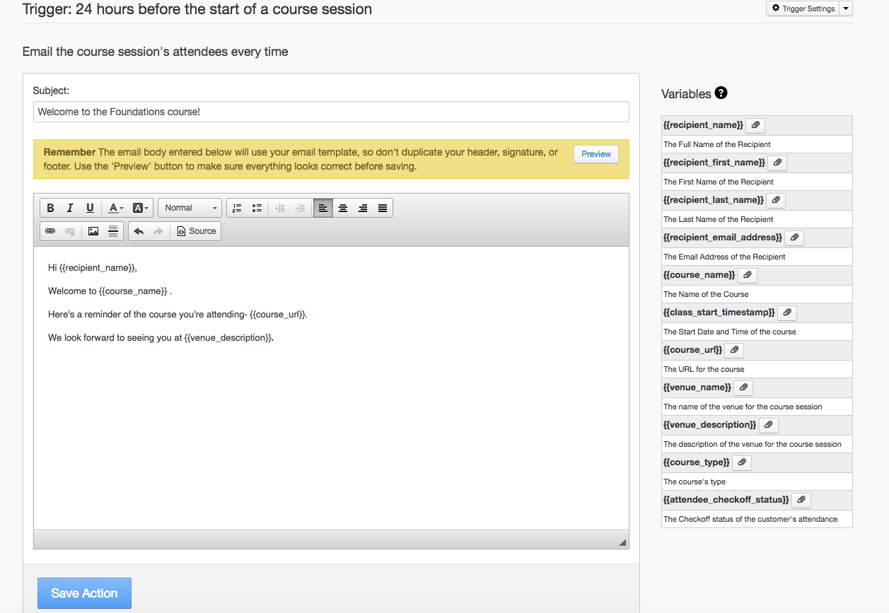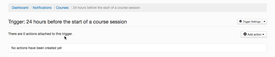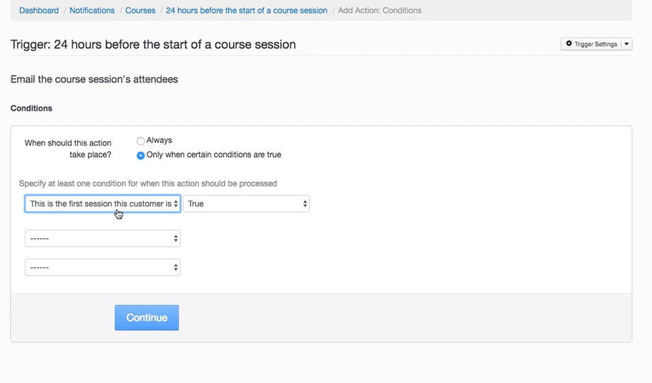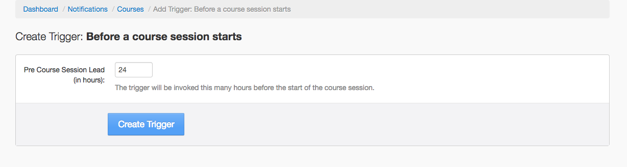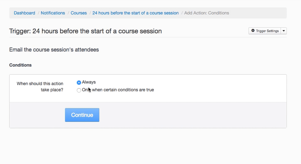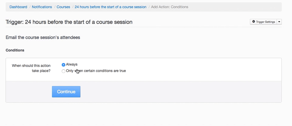 You'll need to decide when the trigger will be sent. In the example below, it will go out 24 hours before a course starts.