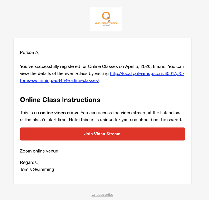 Using the 'class.video_join_button' for classes at online venues will automatically insert a button that links to Zoom into the email under an "Online Class Instructions" section, as seen below.