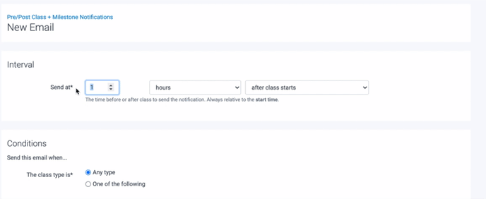 Classes. If you'd like the email to get sent for all classes/appointments, choose "any type". If the email should only go out for a specific class or appointment, or several, select "one of the following" and tick the applicable classes/appointments.