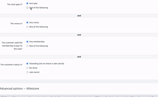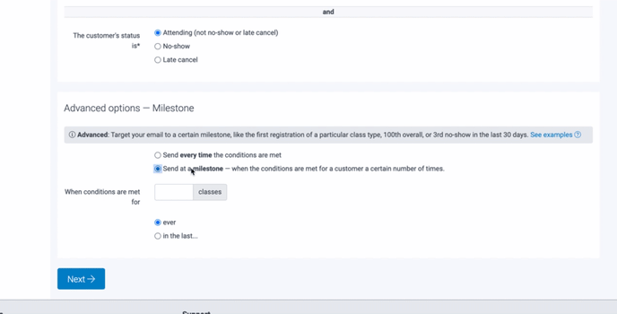 The 'Advanced options' settings allow you to target your email to a certain milestone, like the first registration of a particular class/appointment type, 100th overall, or 3rd no-show in the last 30 days.