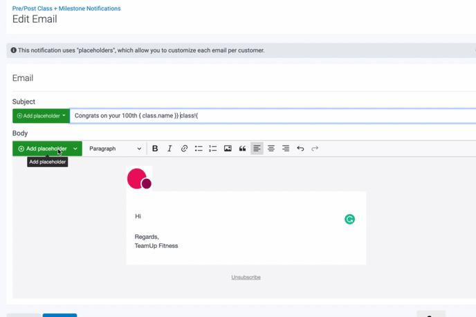 On this page, you'll be able to create the email. You can add placeholders* to customise the email further.