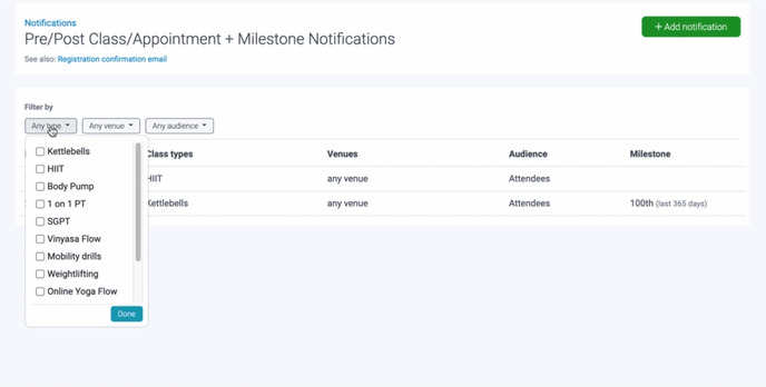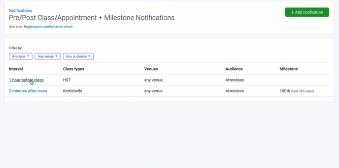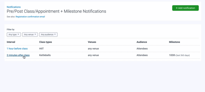 Head to Communications >> Notifications >> Class/Appointment Registrations >> Pre/Post/Milestones >> click 'Detail' >> click 'Add notification'.