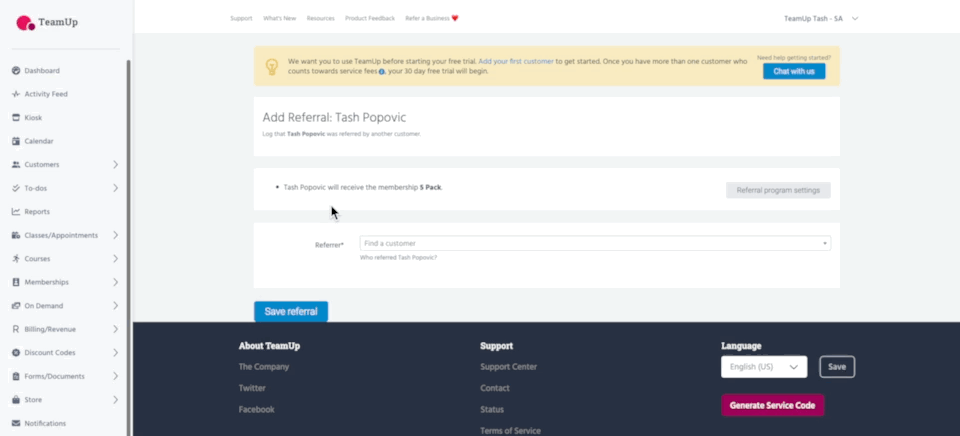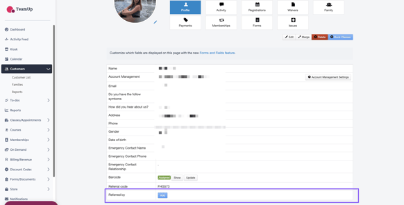 Referrals can be added to a customer profile from your business dashboard on TeamUp.
