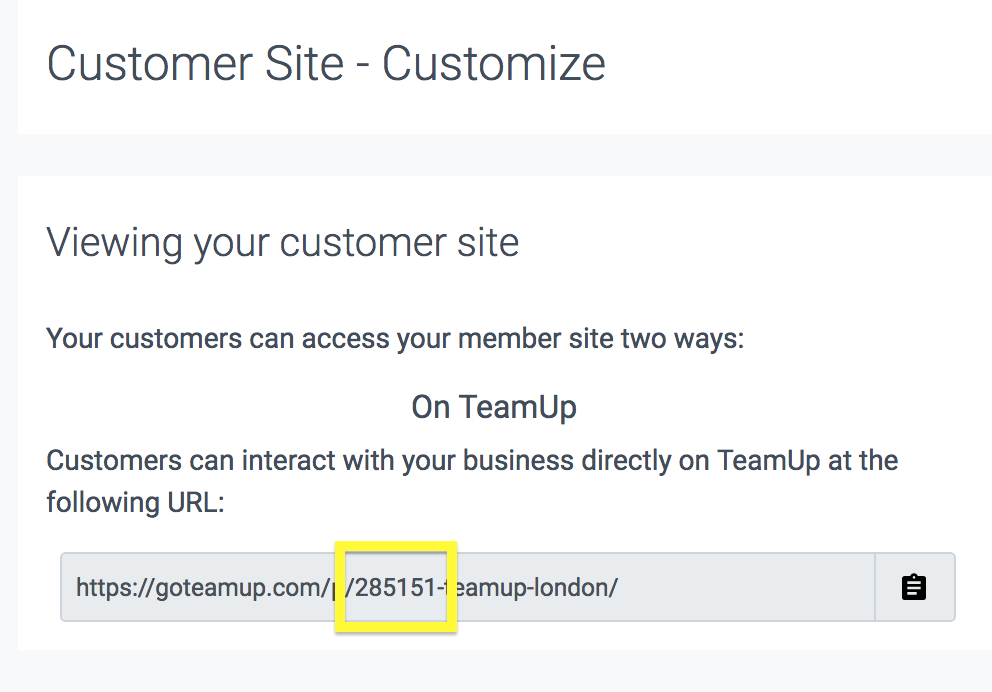 Before being able to add the widget to your Google Sites powered website, you must first find your Provider ID. This can be done on the Customer Site>>Customise page (https://goteamup.com/providers/customer_site/customize/). It is the number outlined in yellow in the screenshot below, 285151 (don't use our example ID!).