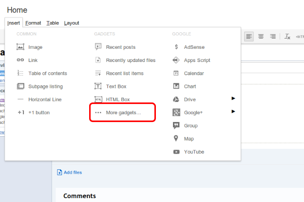 After you have your Provider ID, go to the page editor on Google Sites where you'd like the widget to appear. Under the "Insert" menu, select "More Gadgets".