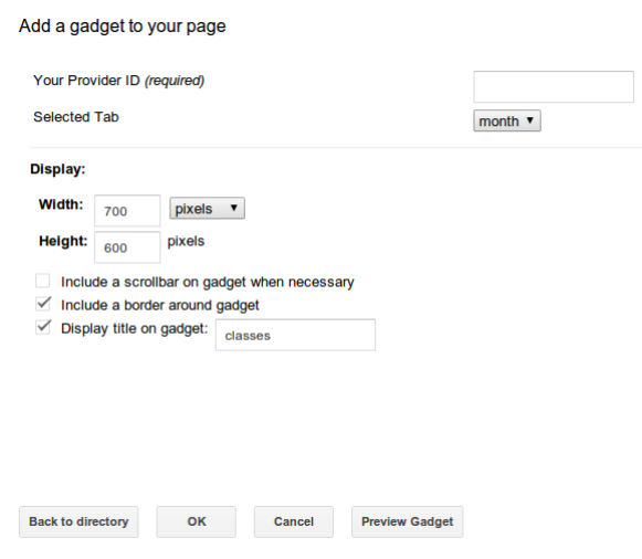 On the next screen, you can configure the widget. Enter your Provider ID and then select the default tab and set the width and height. Note: The Google Sites widget does not yet support the "Free Trial Widget" functionality.