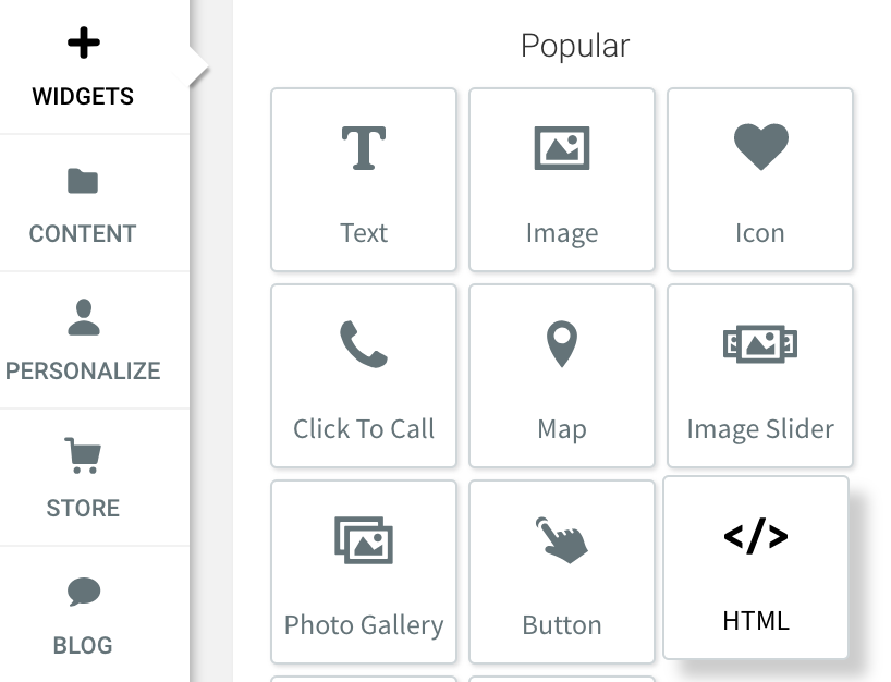 Now you're in the editor, please navigate to the section of your website where you'd like to install the widget and once there, click on the "Widget" option on the left-hand menu, click on "HTML" then drag the component onto the page.