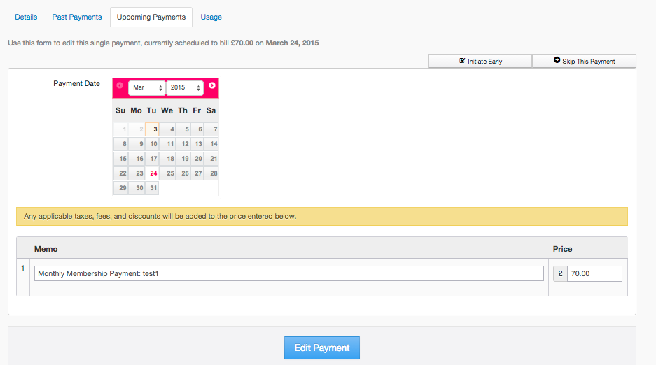 Pick the payment you want to edit and you will be taken to a page to edit that individual payment. Here you can change the bill amount, change the dates (useful if the customer wants to delay payment for a particular month), skip this payment, initiate payment early, and you can also edit the description for this one payment to contain an explanation.