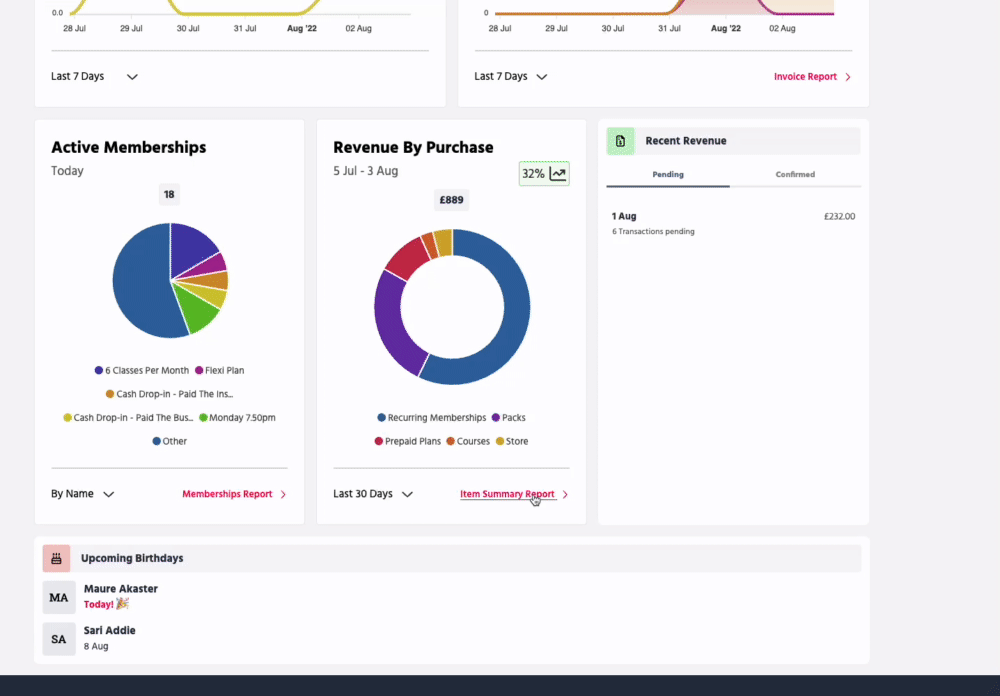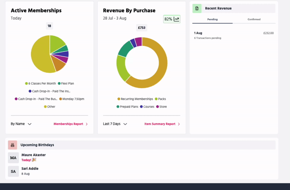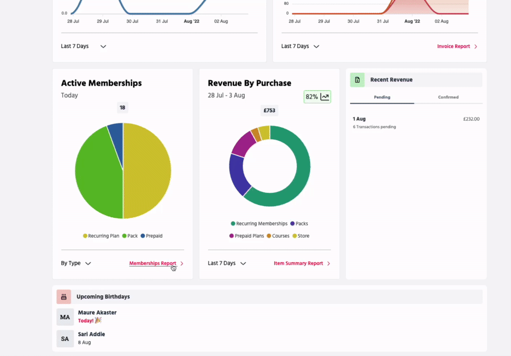 Find out in seconds which memberships are the most popular! This helpful chart shows how many active members (customers who currently have an active membership) you have today.