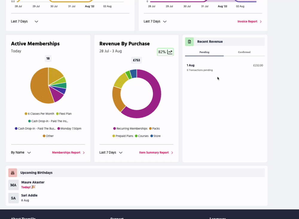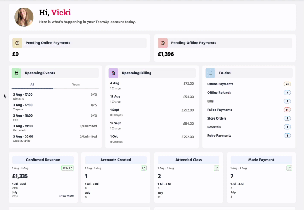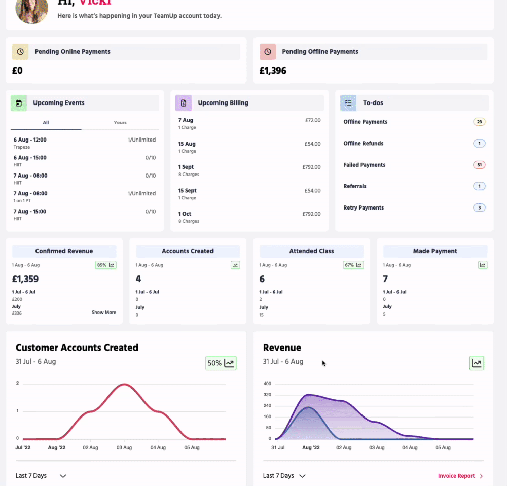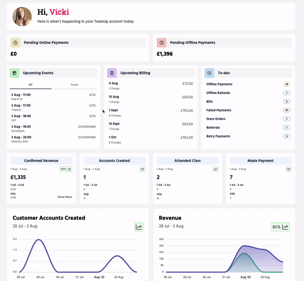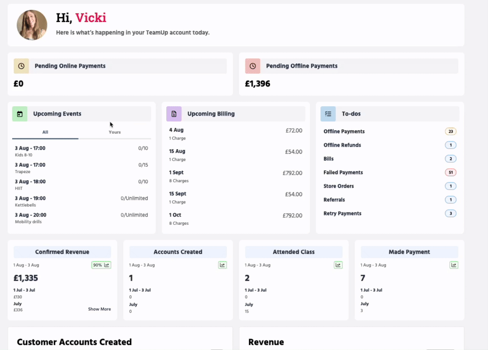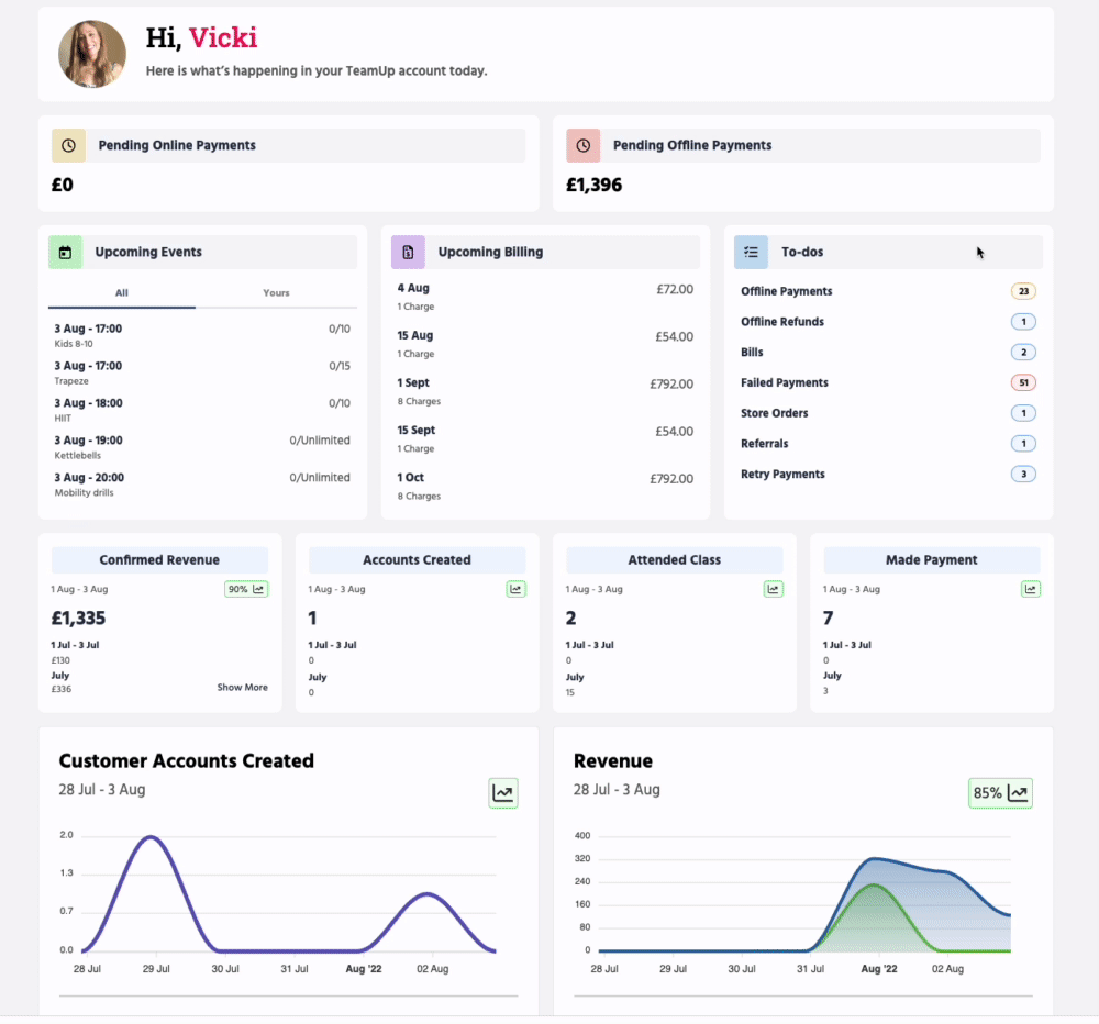The Dashboard gives you an overview of what's happening in your TeamUp account. You can see at a glance if there are any pending customer payments, scan your upcoming events, check your revenue, and much more.