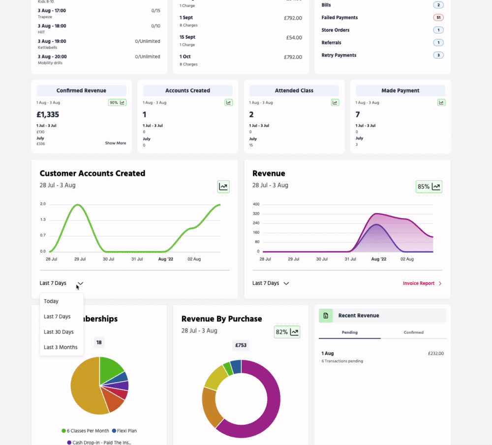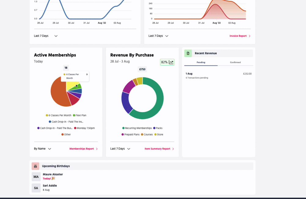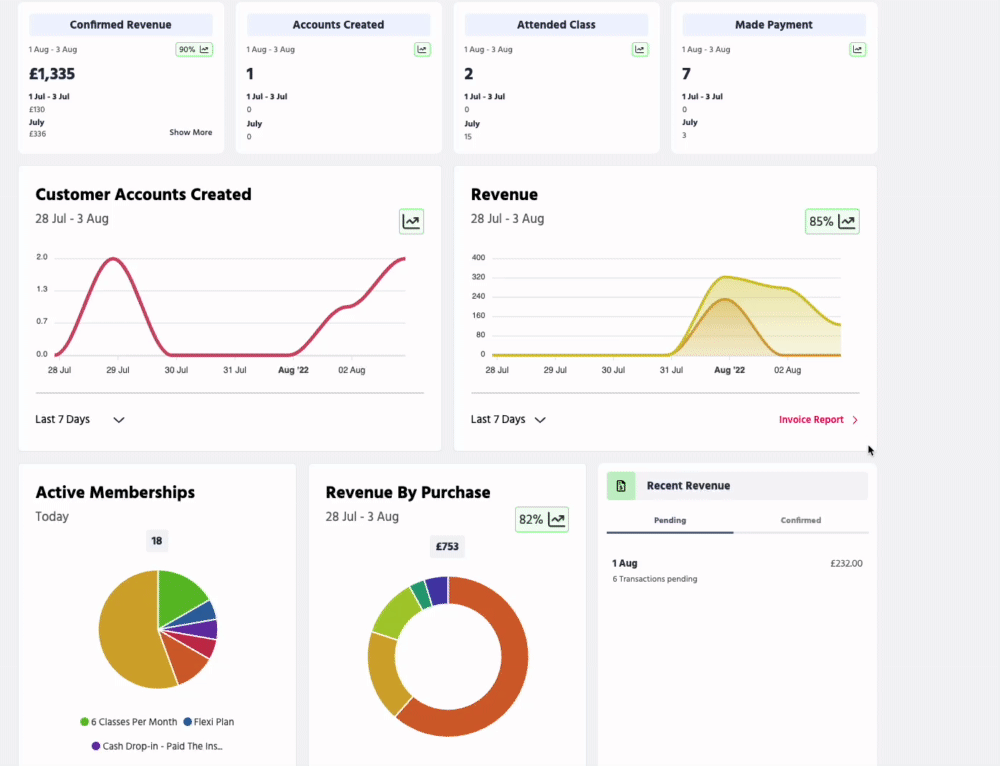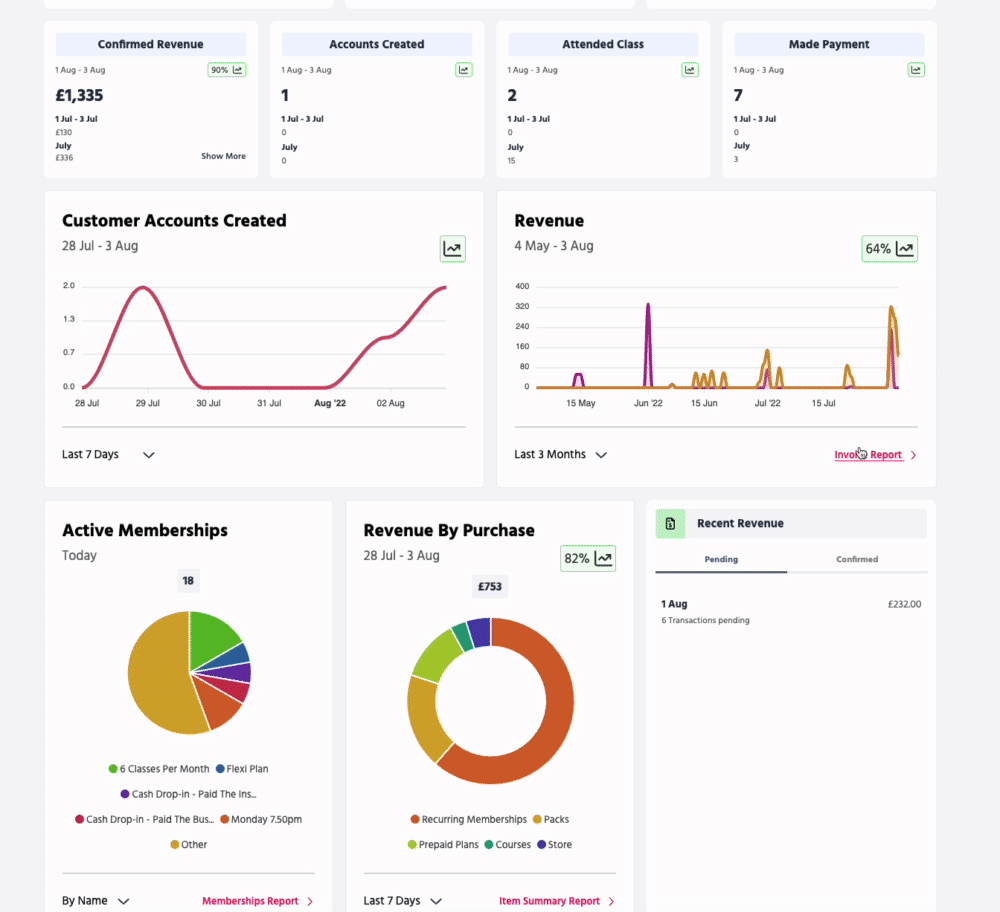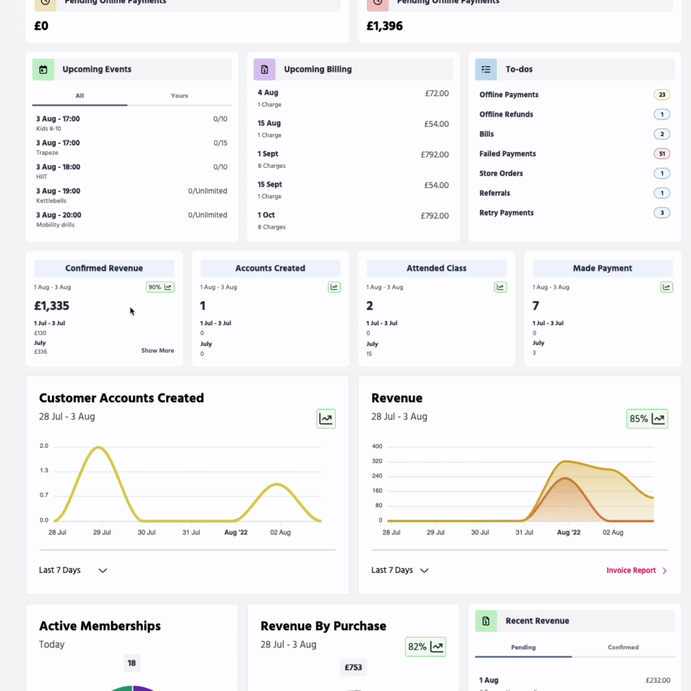 The Dashboard gives you an overview of what's happening in your TeamUp account. You can see at a glance if there are any pending customer payments, scan your upcoming events, check your revenue, and much more.