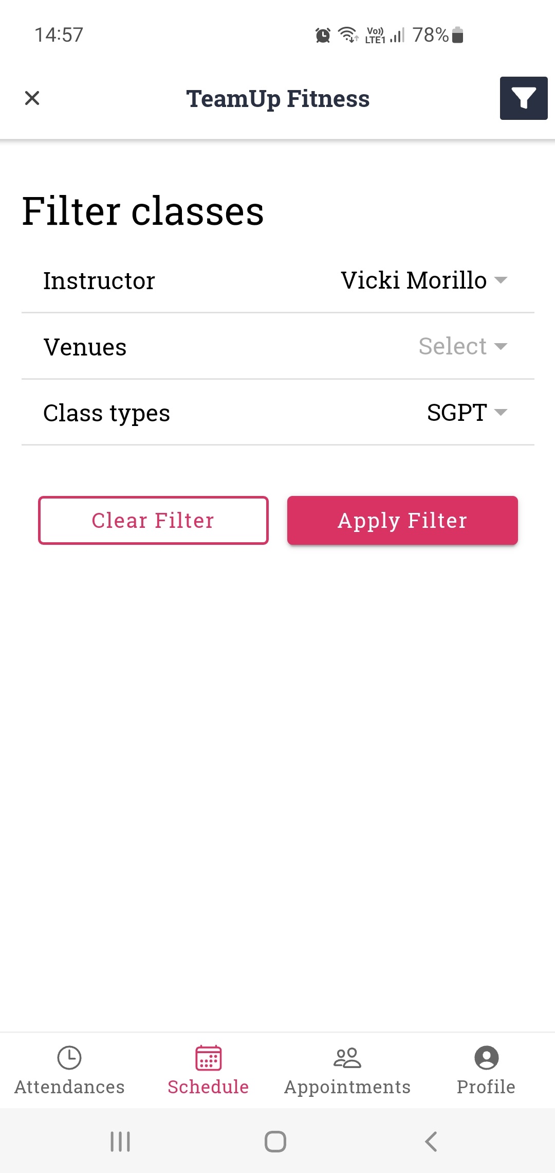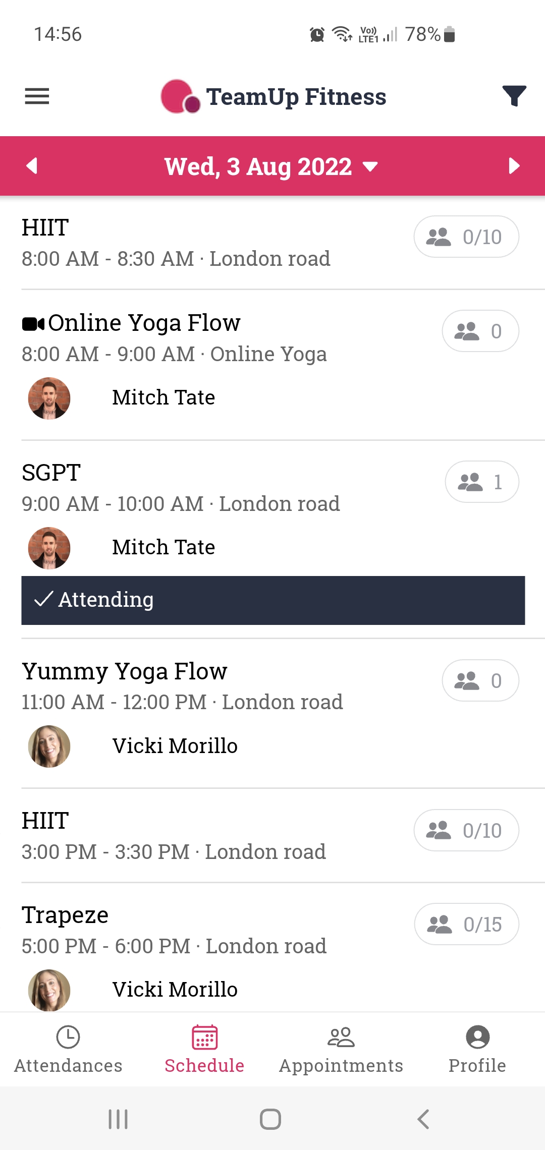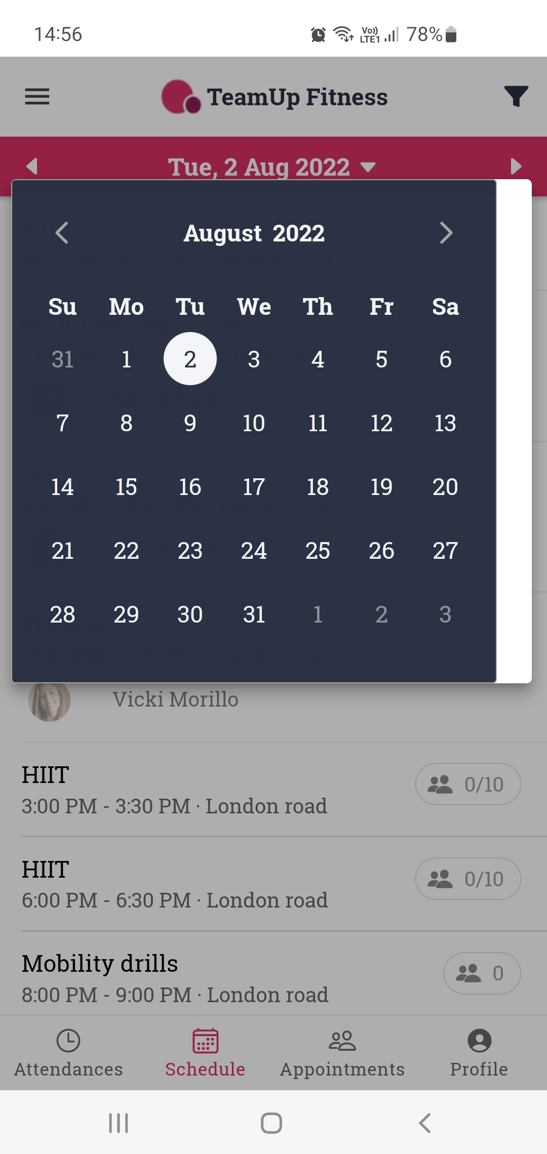 The schedule displays the current date by default, but you can swipe left or right to view other dates, or tap the arrow next to the date to display a dropdown calendar.