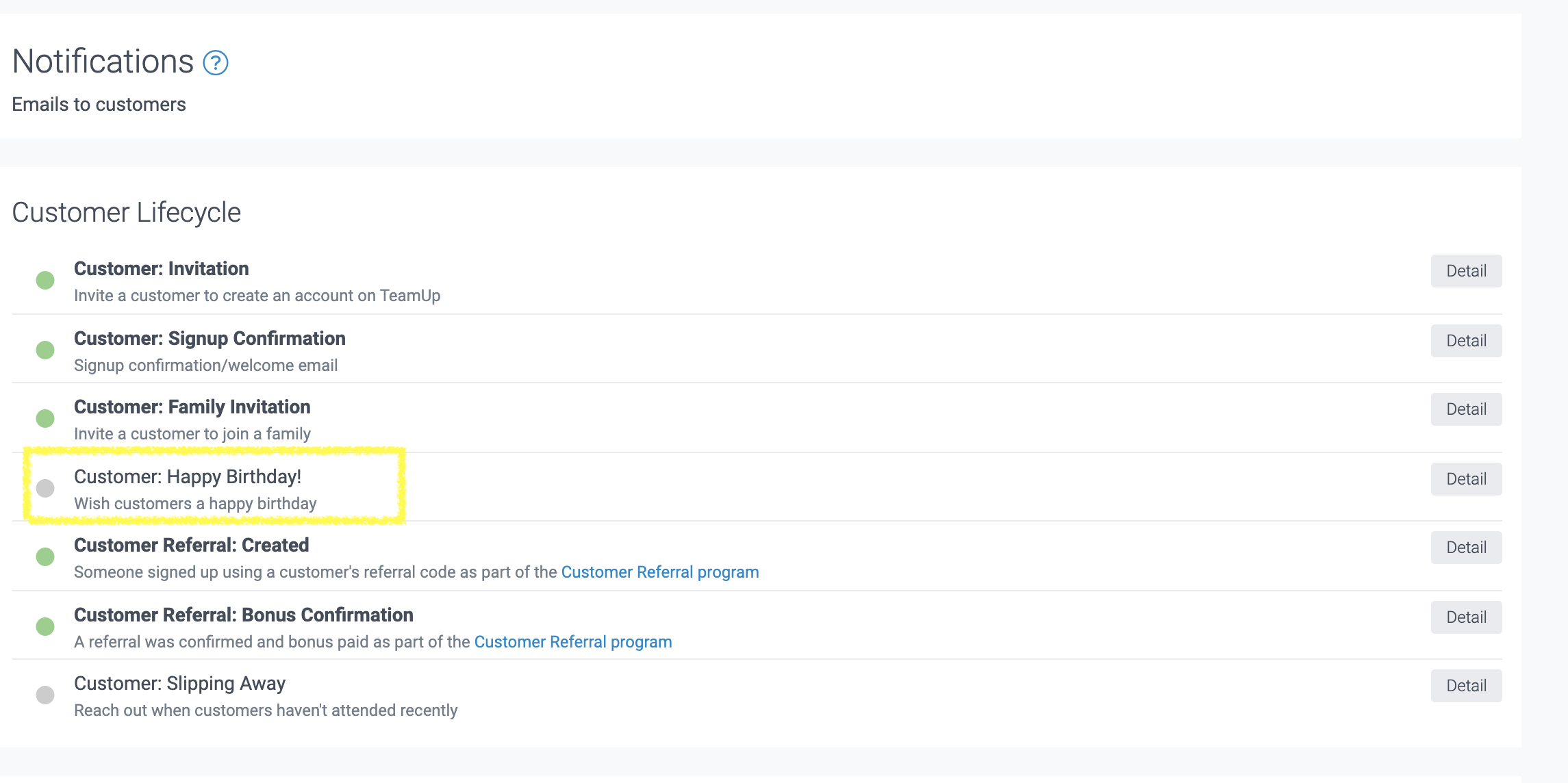 Head to Notifications >> Customer Lifecycle >> Customer: Happy Birthday! to get started.