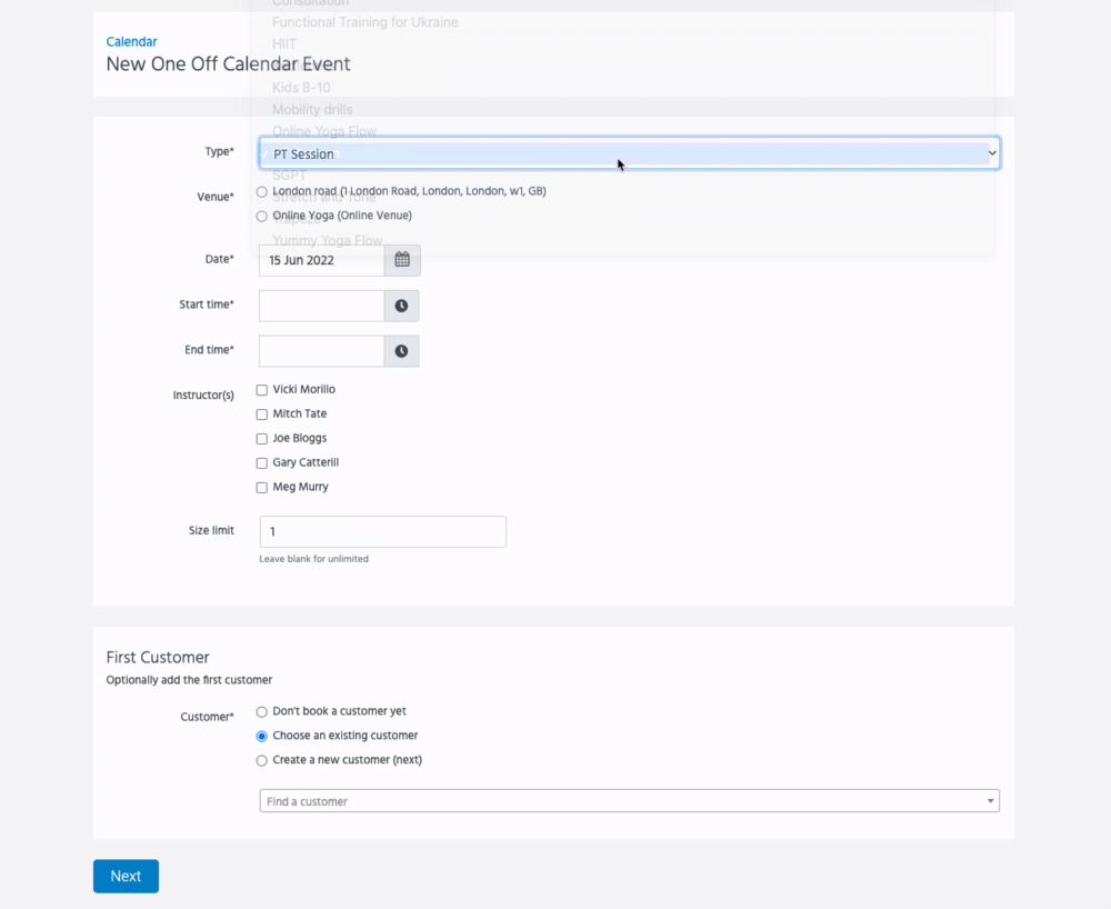 2. Select the desired Appointment Type from the dropdown. In this step, you'll also be able to select the venue, the date in the past, and all the other details of the session, such as start and end time, instructor, and size limit.