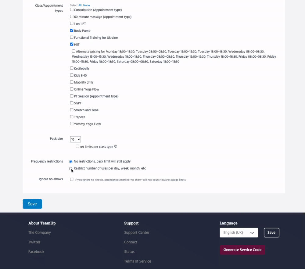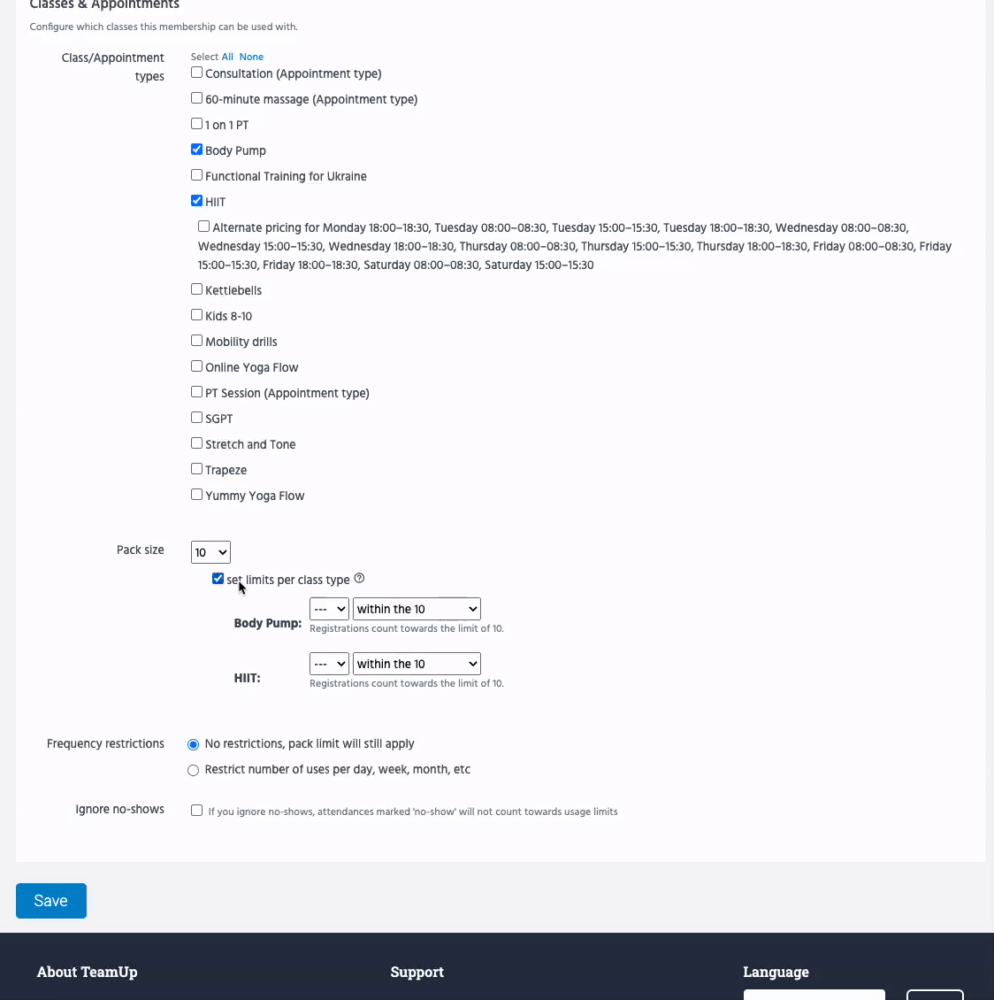 Pack limits control how many sessions the customer will get on the pack they purchase. Below are some examples of simple, and more advanced pack limits.