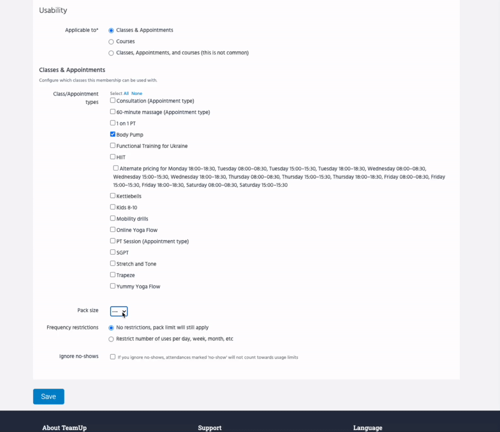 Note: If you've already created your Pack and are looking to edit usability, head to Memberships >> Memberships >> Click desired Pack>> Click 'Edit' beside the Usability section.