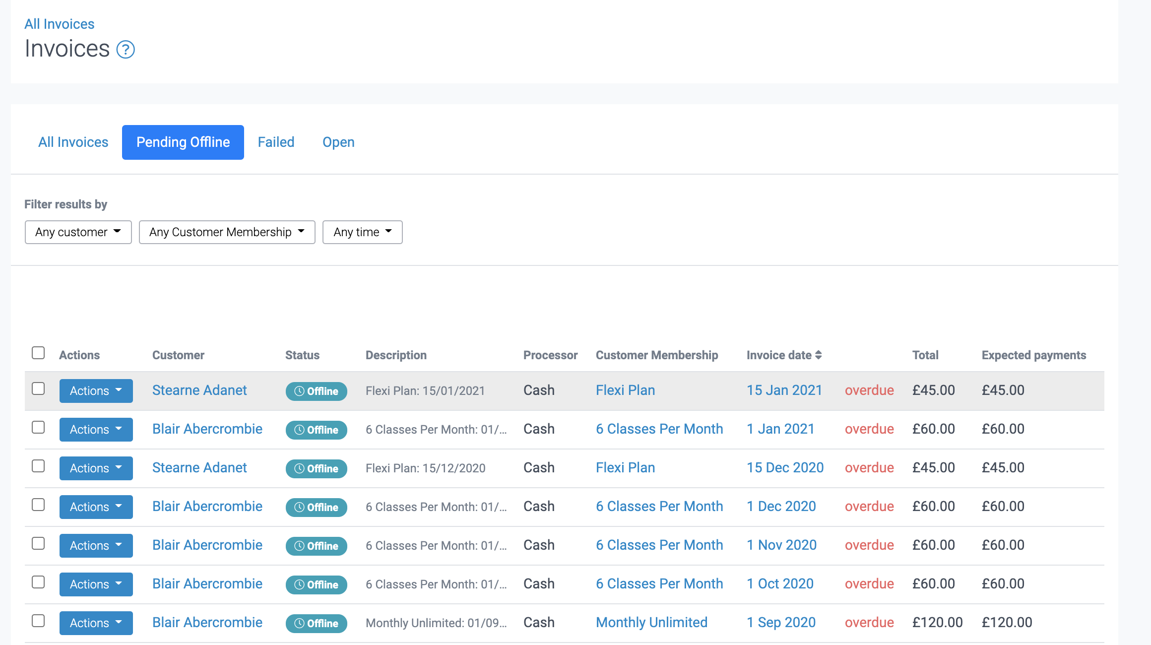 There are two sets of actions for pending offline payments in the 'Actions' menu next to each payment. Let's take a look at each one.