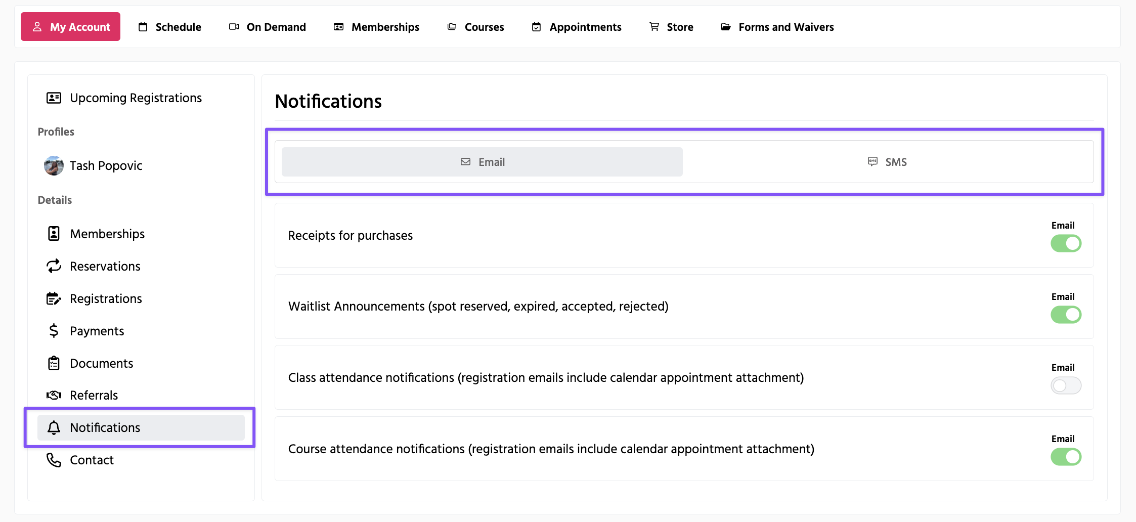 Here you can select which notifications you would like to receive via email and if available SMS.