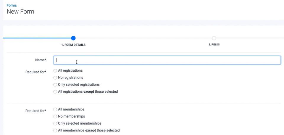 On the next page, first, enter the Name of your new Form (please note that the wording used will be displayed on the customer purchase/registration flow), and then choose what the Form is required for.