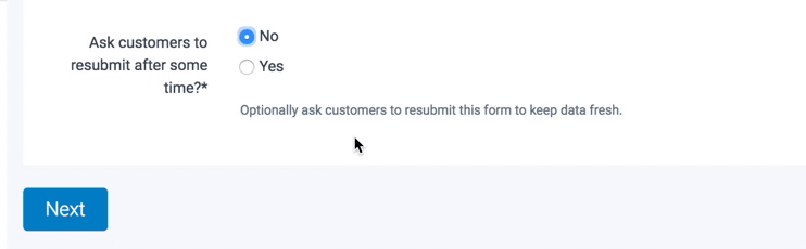 Next, choose whether you want customers to be asked to resubmit the form again in the future and if so, after how many weeks. For example, you may have health-related questions in your Form that you want customers to answer every 24 weeks. Once you've made your choice, click "Next".
