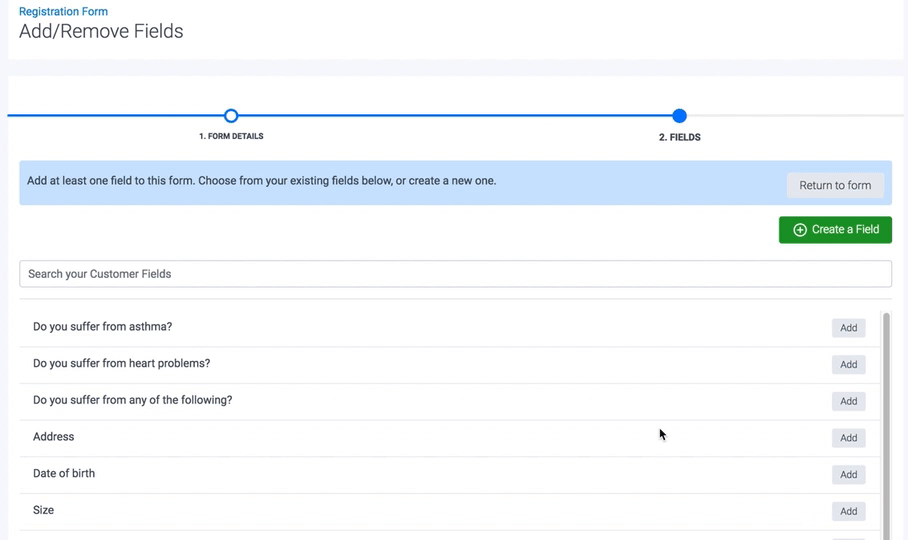 Finally, on the next page, choose which Fields you wish to include in your Form. For this, simply click Add next to each one, and once done, your Form is then ready to be used: