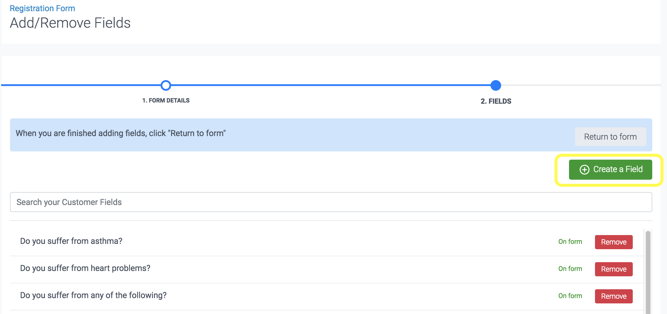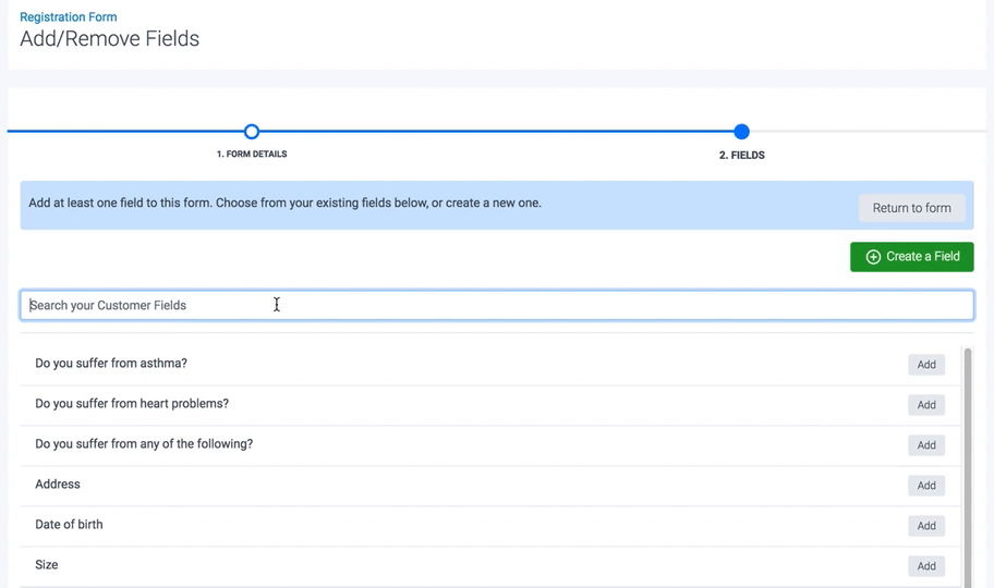 In this page, you can also click the "Create a Field" if you want to create a new field that you want to include in your Form, but it's not currently available in your Customer Field list.