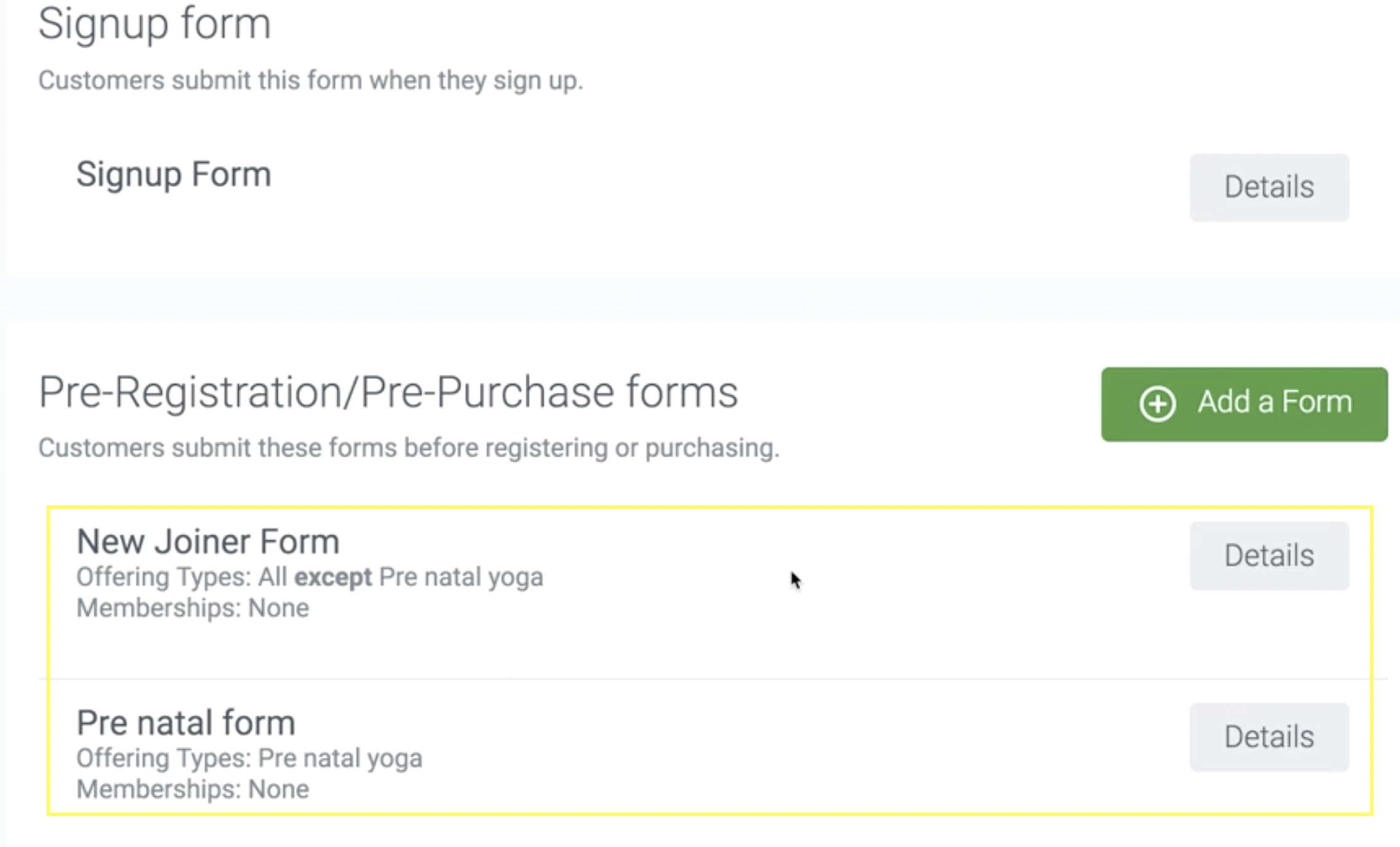For example, if you're offering a Pre-natal Yoga class, you may want to collect relevant information about participants (i.e., due date, do they have any pregnancy-related issues, etc.). These questions would only be relevant to people attending this class, so you would make this form applicable only for this registration.
