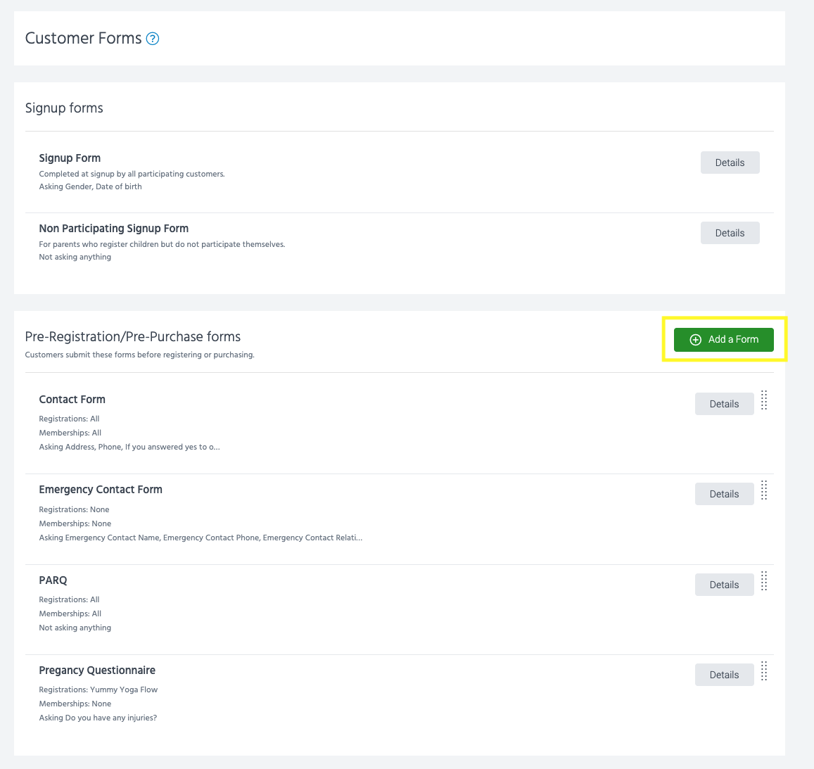 From your TeamUp account, you can target customers who you want to fill out specific pre-registration and pre-purchase forms. These forms are submitted by customers the first time they make an applicable registration or purchase on the customer site.