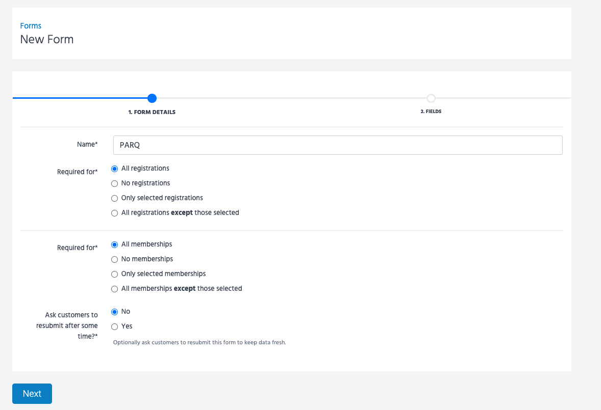 Once you've completed this information, click 'Next' to select the fields that should be asked in this form.