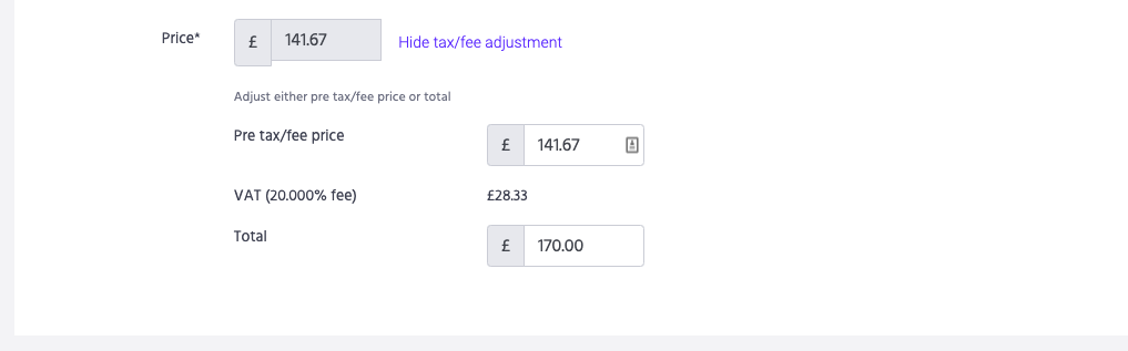 This is made easy using our fee calculator which you'll find anywhere you can update pricing i.e. classes, memberships. Here you'll simply enter the total price you want the customer to pay and the system will work out the rest. In the below example the total price the customer pays is £170 and the pre tax price is 141.67.