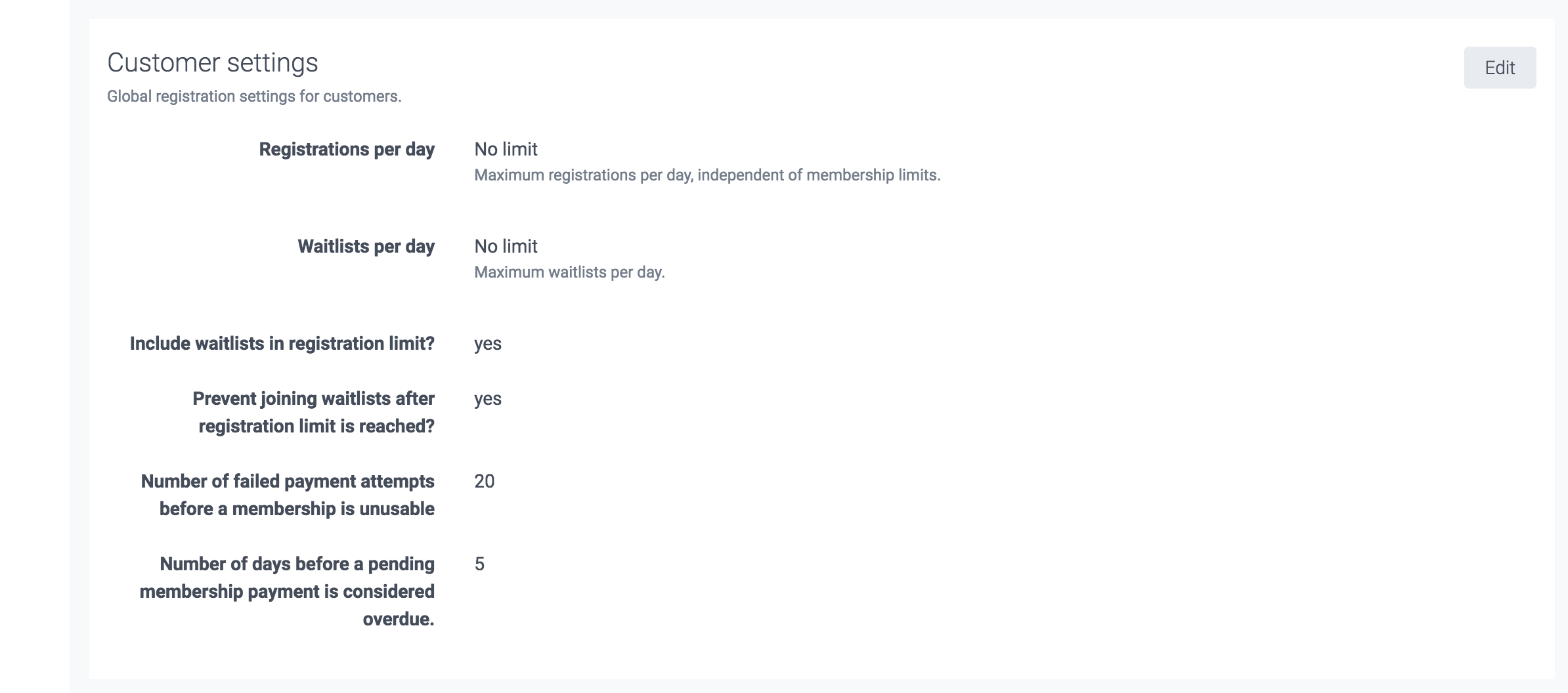 Number of days before a pending membership payment is considered overdue - Once you've set the number of days here, you may wonder how you can block a membership from being used if it has overdue payments. For more information on this topic, please see How can I block a membership from being used when it has pending payments.