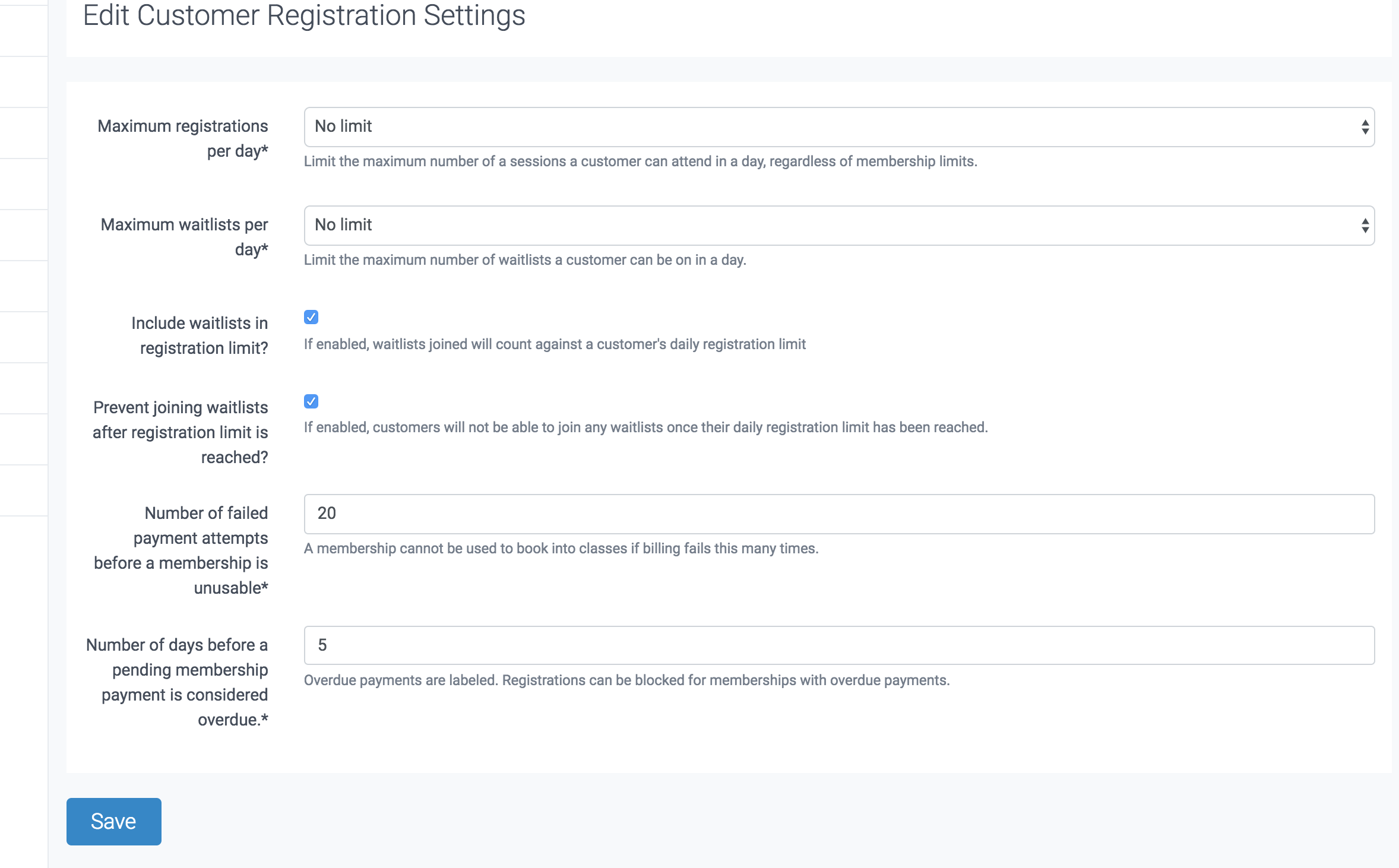 Prevent joining waitlists after registration limit is reached? - Enable if you would like to prevent your customers from joining waitlists after they've reached the registrations per day limit.