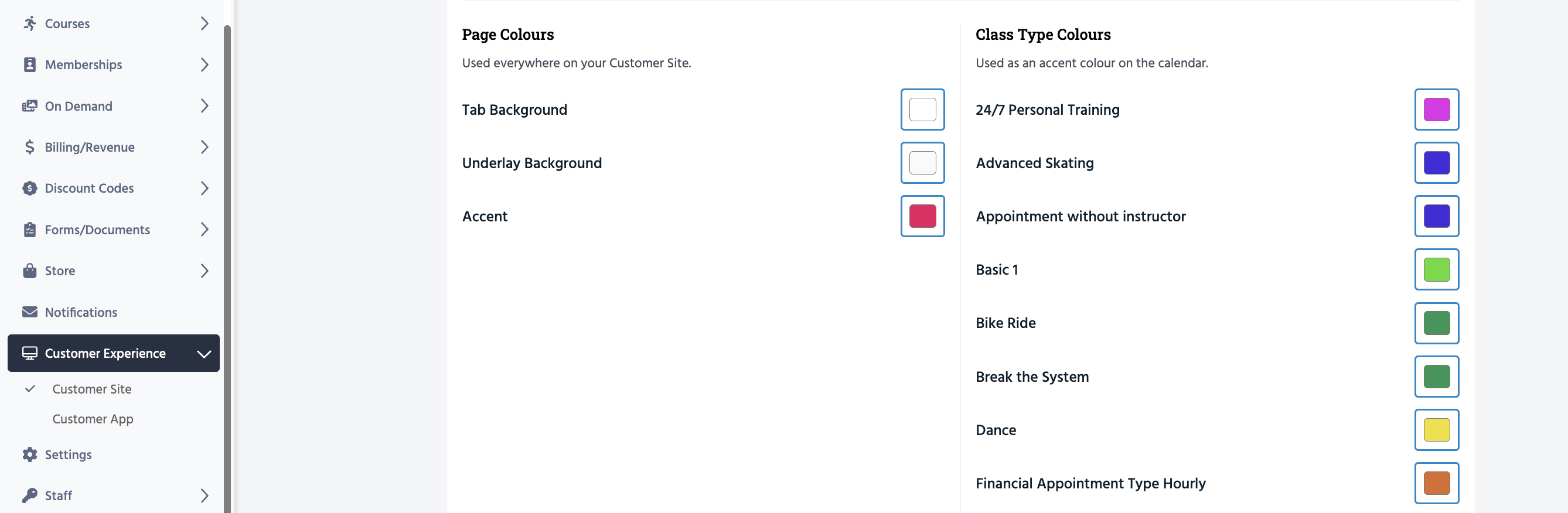 Change the page colours, class type colours and font by selecting your desired types from the drop-down options.