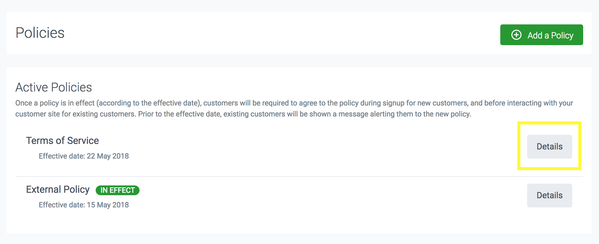 Head to Forms/Documents >> Policies and click Details besides the policy you'd like to archive.