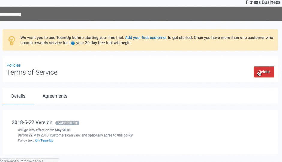 Deleting a policy is only possible if 0 customers have accepted the policy.