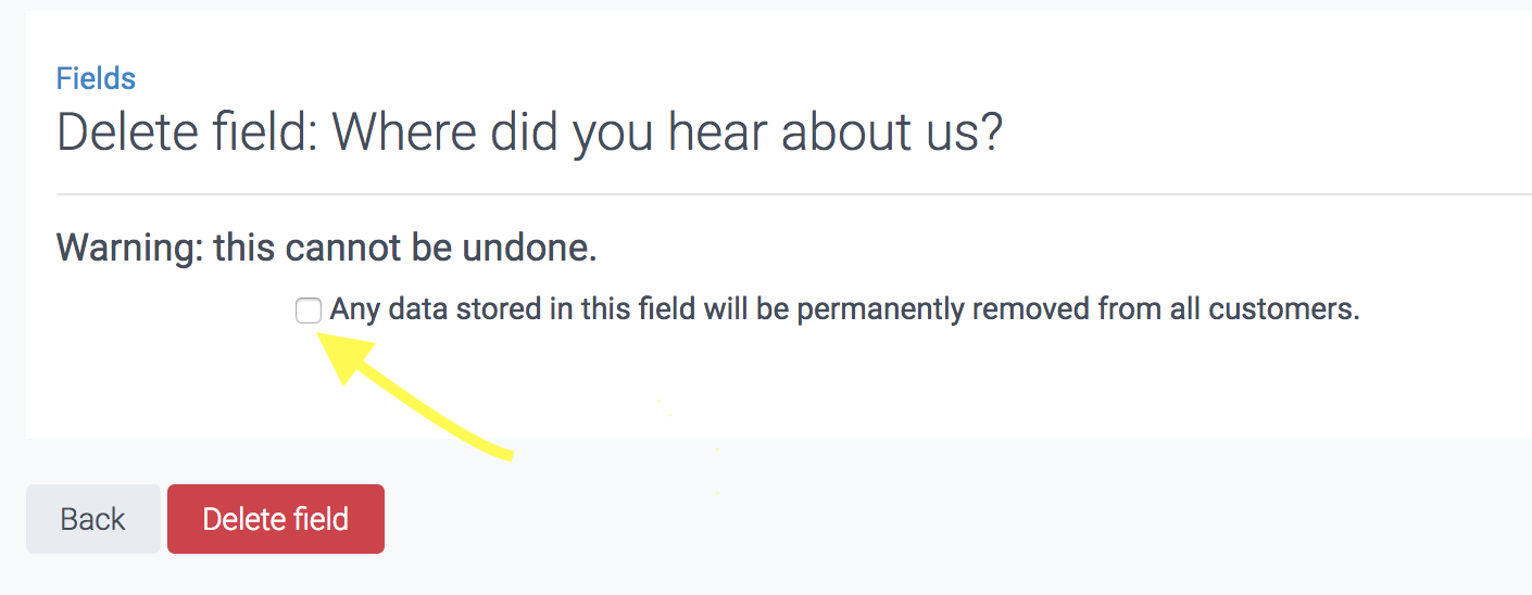 On the next page, you'll see a confirmation page reminding you that the action cannot be undone and asking you to confirm that you're aware that "Any data stored in this field will be permanently removed from all customers". Simply tick the box and finally click on "Delete Field" button: