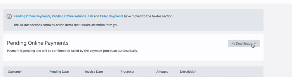 Navigate to Billing/Revenue >> Pending. Here, click 'Downloads - Pending & Upcoming'.