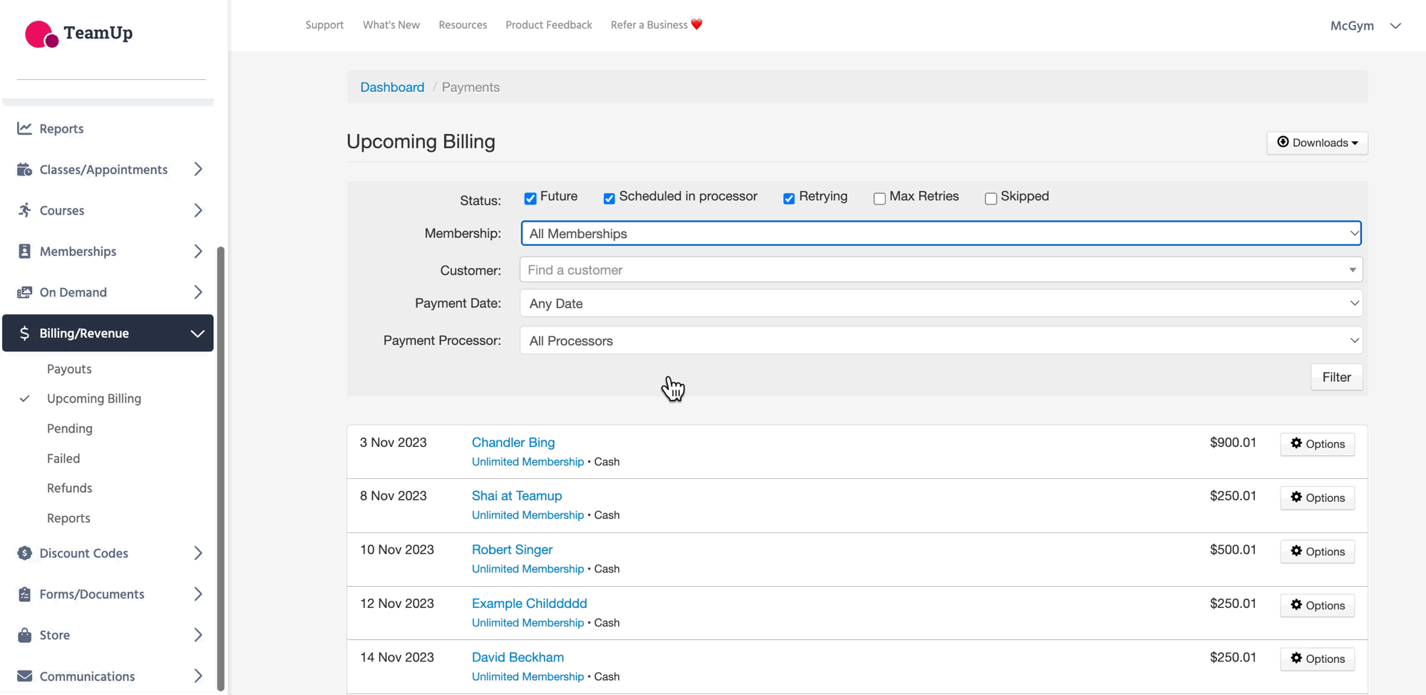 In Billing/Revenue >> Upcoming Billing, you have filters that allow you to refine your search before editing anything.