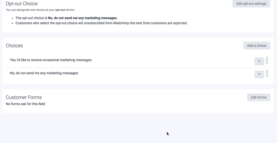 On the next page, you'll be able to see the existing settings under the Opt-out Choice section and edit them by clicking on Edit opt-out Settings button where you'll then have the option to tick/untick your choices as desired, including whether you want the customers who opt-out to auto-unsubscribe from Mailchimp automatically too, and Save: