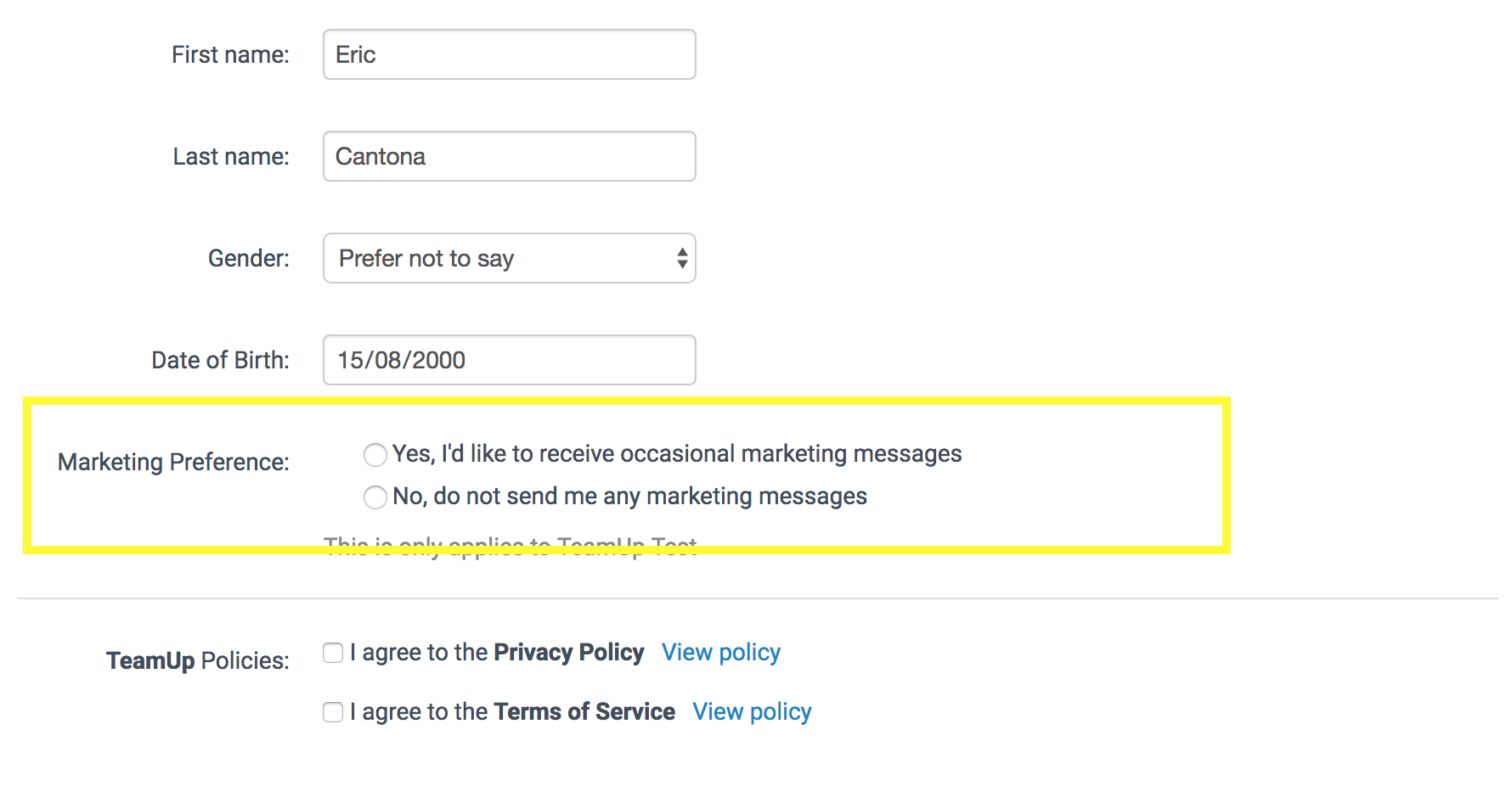 Customers will then be able to decide their marketing preference by selecting the relevant answer choice available as part of whatever Form you have chosen. So, for example, if you have selected the "Signup Form" new customers will see this during their signup, or if you select a Form which is only required when registering to classes then the customer will be prompted to choose their marketing preference when they next make an applicable registration.